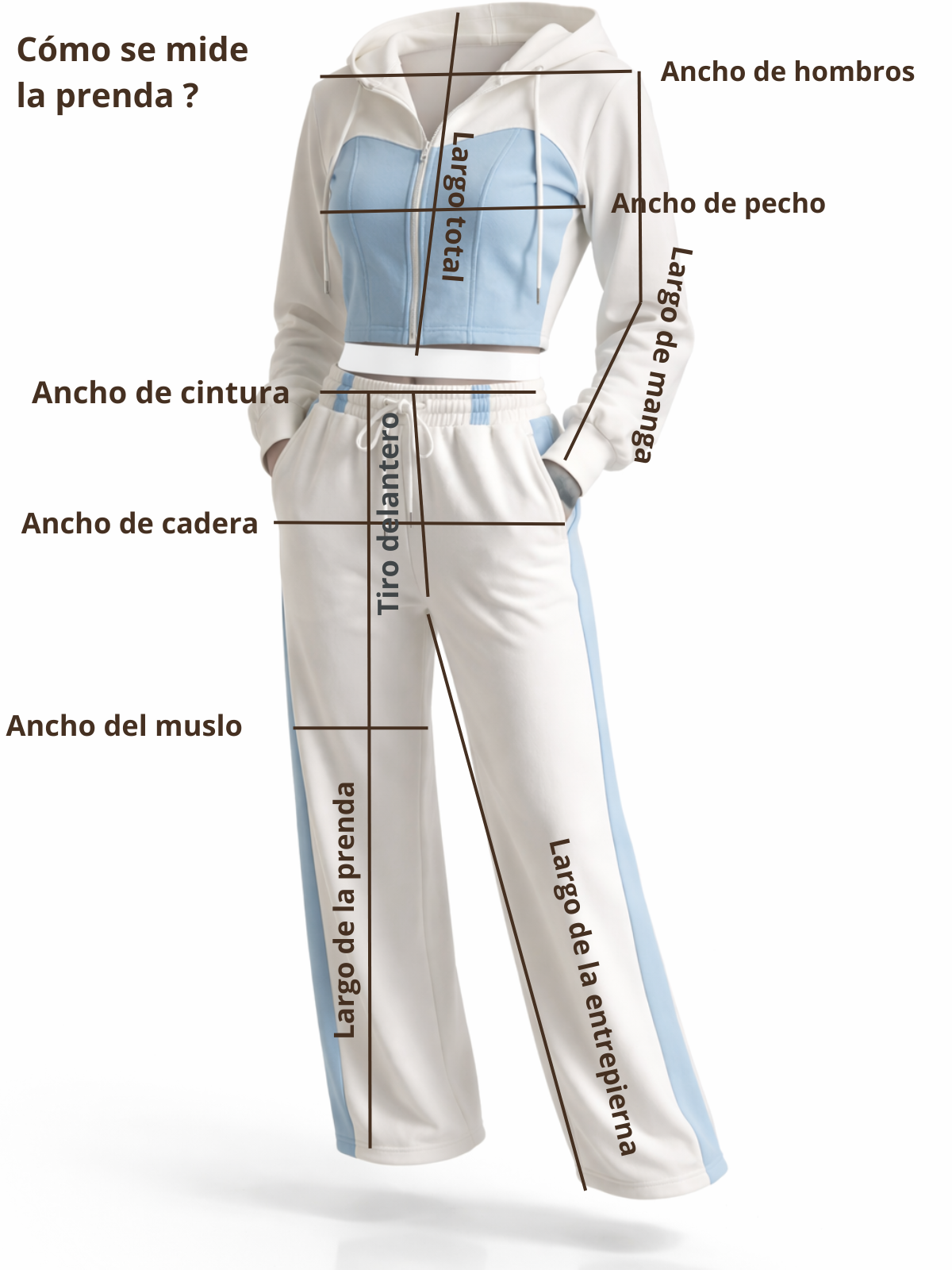 La prenda inferior, jogger blanco tiro alto con franjas laterales celestes, cintura elástica con cordón ajustable, y bolsillos funcionales, rematado con botamangas regulables para usar suelto y relajado o más estructurado según estilo.